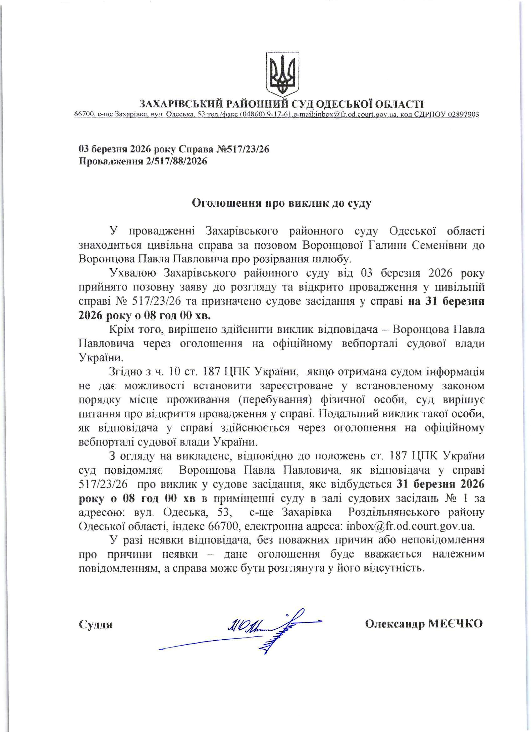 Оголошення про виклик до суду Воронцов Павло Павлович