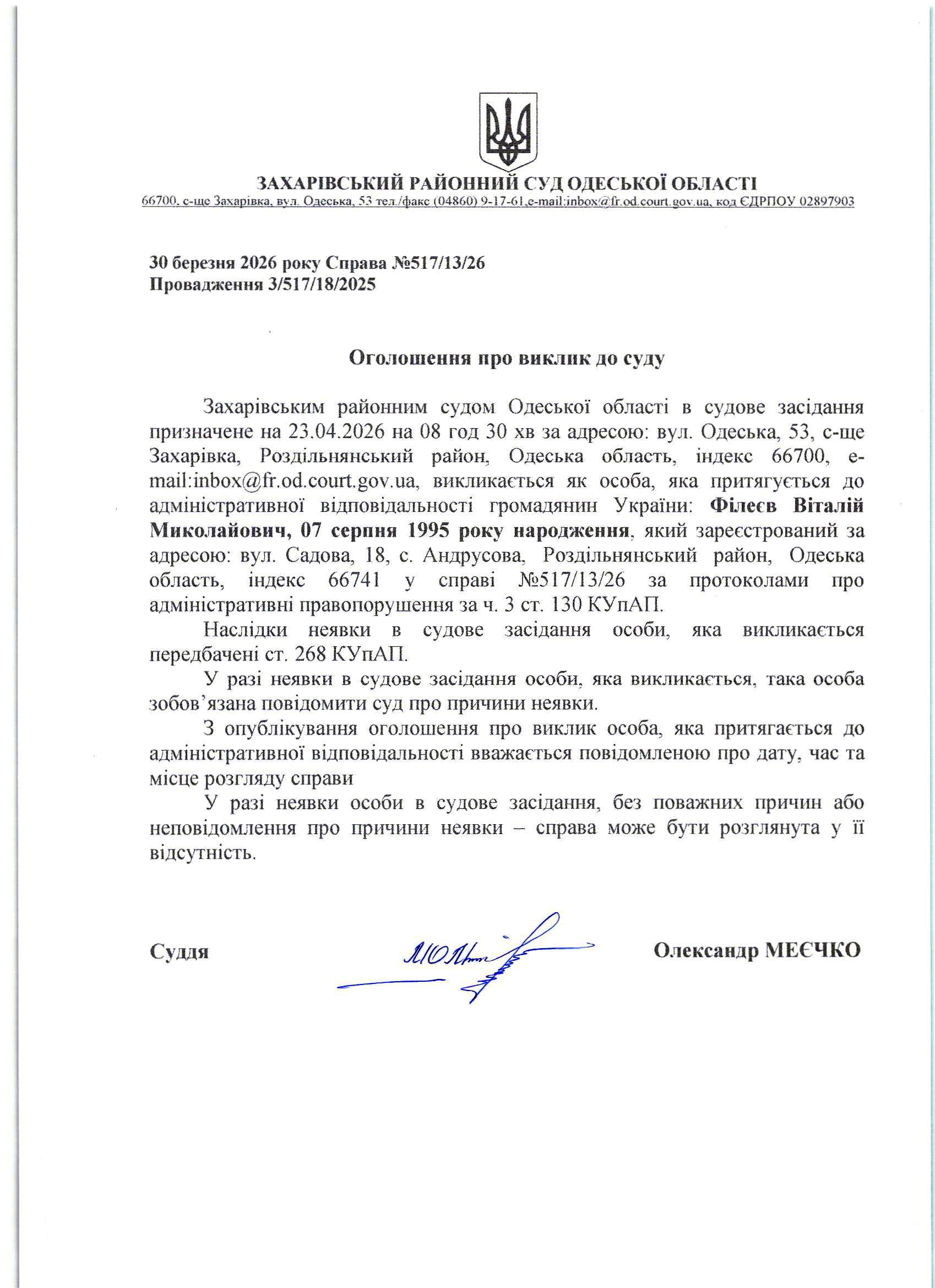 Оголошення про виклик до суду Мотрікале Нікіта Олександрович
